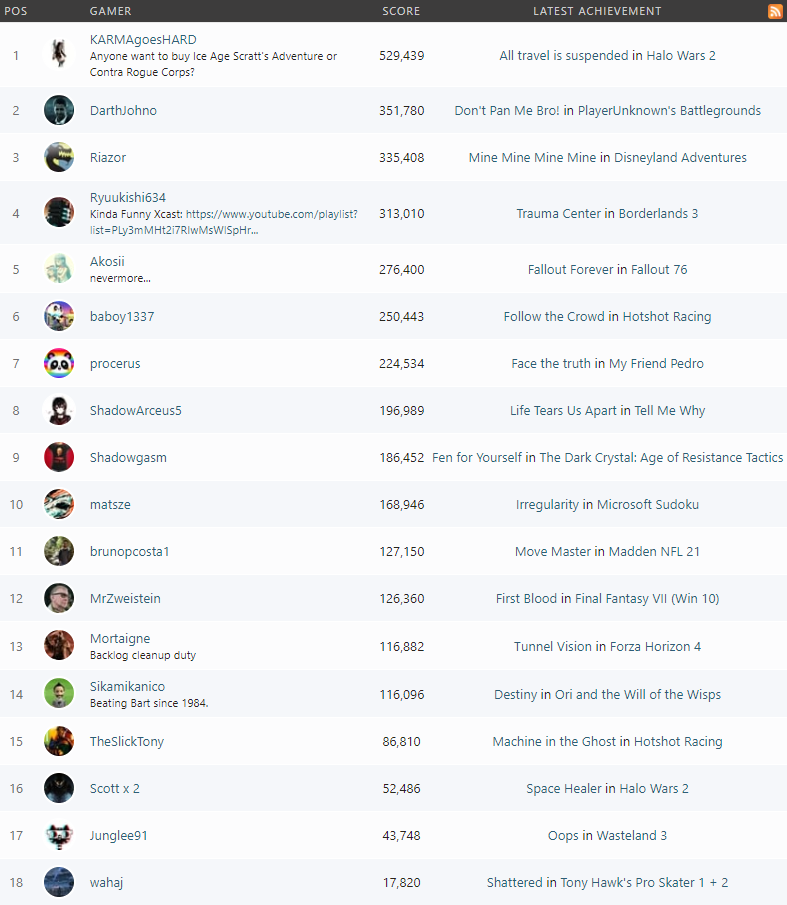 I will probably not score many points this week. I am on endgame for Marvel’s Avengers - so I only have like 10 achievements left, all of which will take me a long time. I also started playing Borderlands 3 and the Mario Collection releases this Friday. ![]()