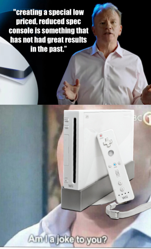 However the jist of his message stays the same and remains utterly baseless. There has been no other comparison of same current gen cosole releasing at different specs. The only comparison that comes to mind is the 2ds except the 2ds was an actual successful launch. What is his opinions based on actually and how do people even logically defend this?