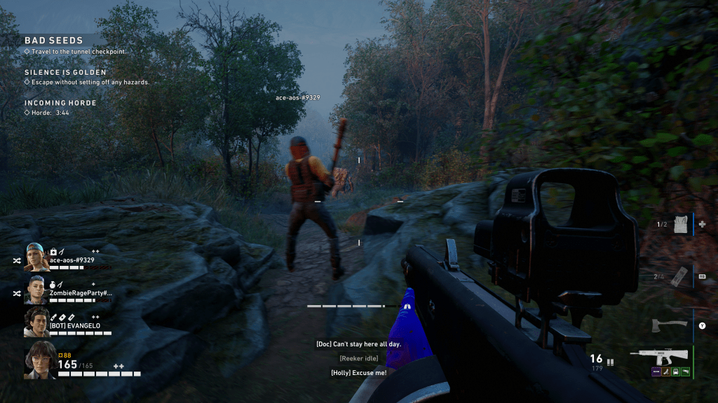 The game features a standard number of weapon types. For your main slot you can get shotguns, SMGs, Assault Rifles, Rifles, Sniper’s, and LMG’s. The secondary slot is for melee weapons, pistols, and sawed-off shotguns. Melee weapons use a stamina system that is also tied to your ability to run. It can be punishing early on, but as you upgrade your stamina you can focus on a full melee build if you’d like as melee weapons never break and have unlimited “ammo” they are fantastic if you’re in a good group. I found myself using shotguns and melee weapons more than anything on console because as I said earlier, the controls never feel good for any type of medium to long-distance shooting. Initial settings are incredibly twitchy, with far too much aim acceleration. Even after attempting to dial things in it still felt like at random the game would 45 degree turn me the instant I tried aiming left sometimes.