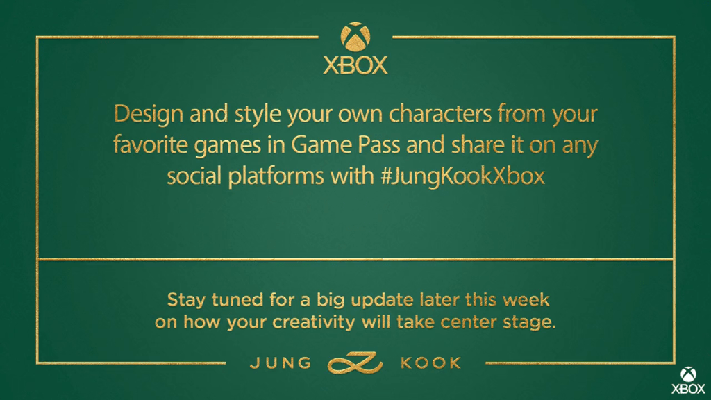 Design and style your favorite Xbox character from @XboxGamePass and share it with #JungKookXbox, then stay tuned for a big update later this week. #PowerYourDreams pic.twitter.com/LydcxiHNQE