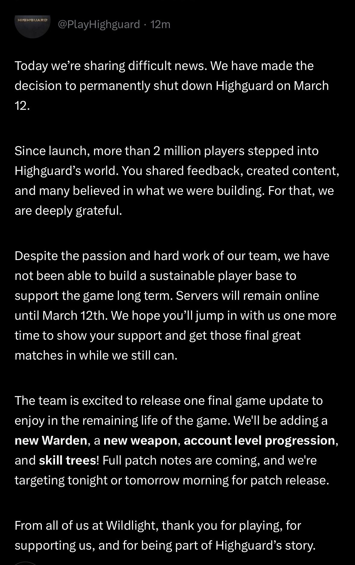 Highguard is permanently shutting down on March 12 pic.twitter.com/aWJmy4cBQc