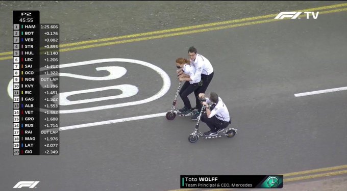 So many questions. Also nice to see F1 folks make a mockery of social distancing.