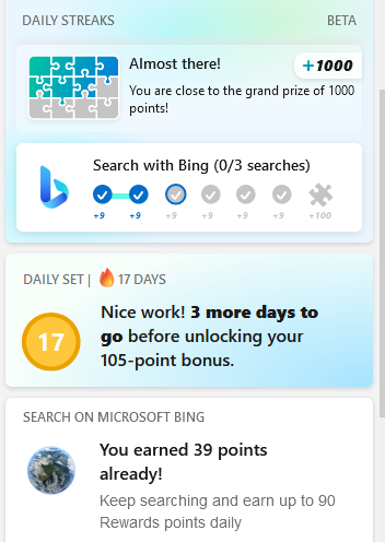 I think I have the hang of it, at least on the desktop. You just have to click three searches to initiate points, and then watch the top right hand corner for the circle to spin. It’s longer than the click a search one after the other, it makes you do a cool down, but it’s not much longer than before.