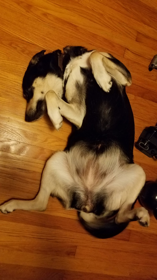 This is Ruby. She often sleeps like this. German Shepherd/Rottweiler mix.