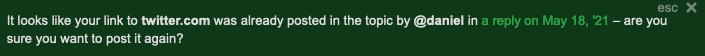 Currently, we receive a warning if we try to share the same link on a topic where it has already been posted, like this: