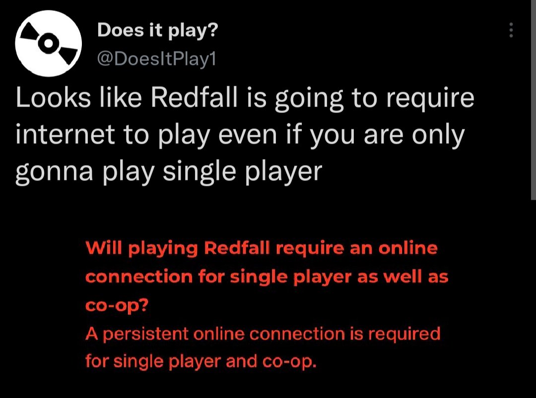 In 2023, having to be connected to the internet to do things does not bother me. Maybe when the apocalypse happens and I want to play Redfall while the world is ending I will be dissapointed I couldn’t play a game one last time. Other than that, I don’t care.