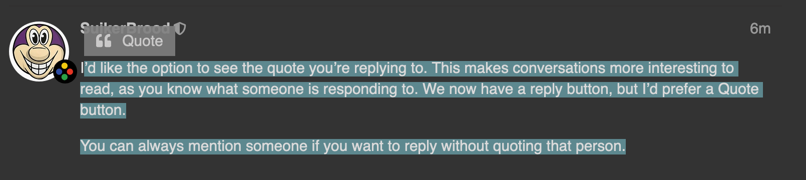 I’d like the option to see the quote you’re replying to. This makes conversations more interesting to read, as you know what someone is responding to. We now have a reply button, but I’d prefer a Quote button.