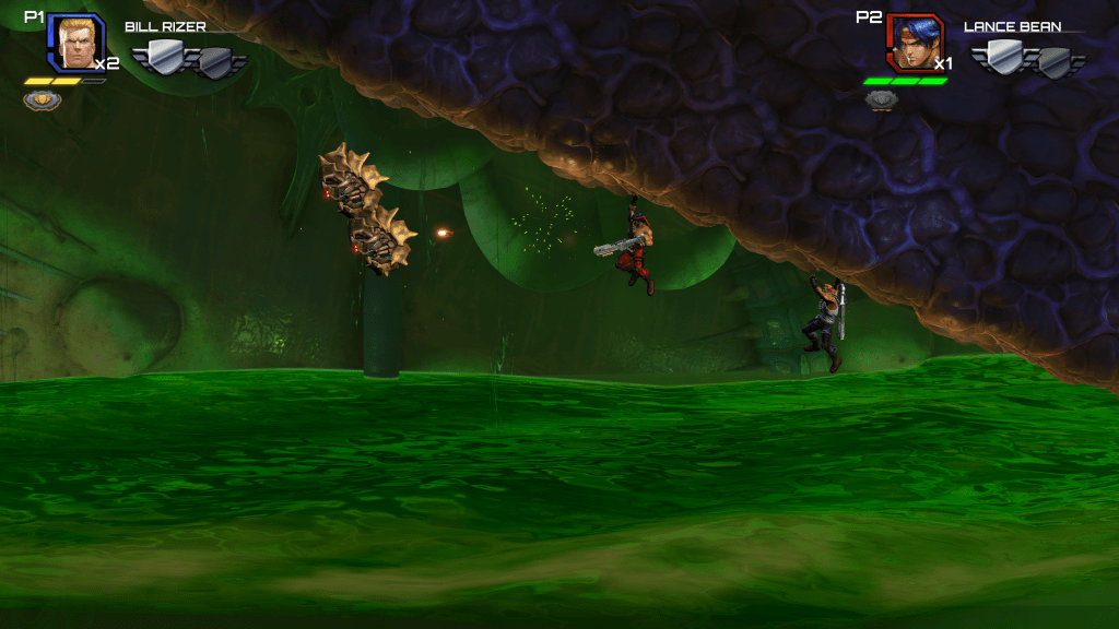 Operation Galuga’s levels leave a lot to be desired, even if it is a remake of the original Contra. The main stages have players running and gunning and then occasionally ride on vehicles to change up gameplay. But a lot of stages end up feeling a lot longer than they should be, and I think that’s because it doesn’t move onto the next gimmick quickly enough. What you’ll sometimes feel like you’re doing is shooting endless amounts of bad guys over and over again without much difficulty and sometimes outright just anchoring in one spot while doing so. The boss fights are fun but are otherwise a brief moment of respite from what are otherwise long hallways where the next segment of action just takes too long to arrive. On the bright side, the story segments were entertaining and I like Steve Blum, so some of the boredom was taken away.