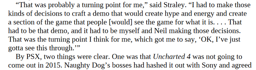 I mentioned this on another forum, but in Jason Schreiers book, Blood, Sweat and Pixels, even when they knew Uncharted 4 wasn’t going to be finished in 2015, they still went ahead and announced it was coming holiday 2015.