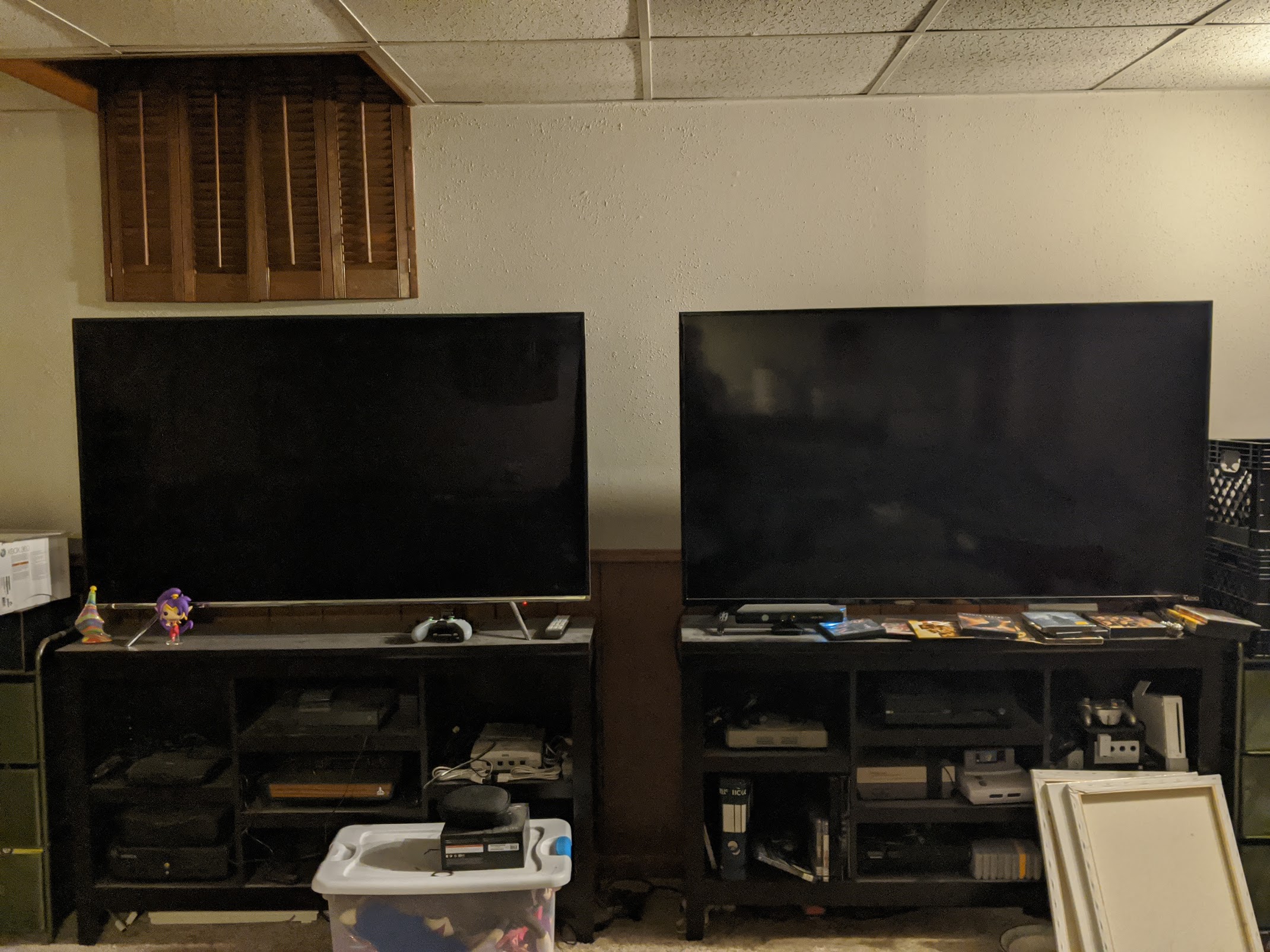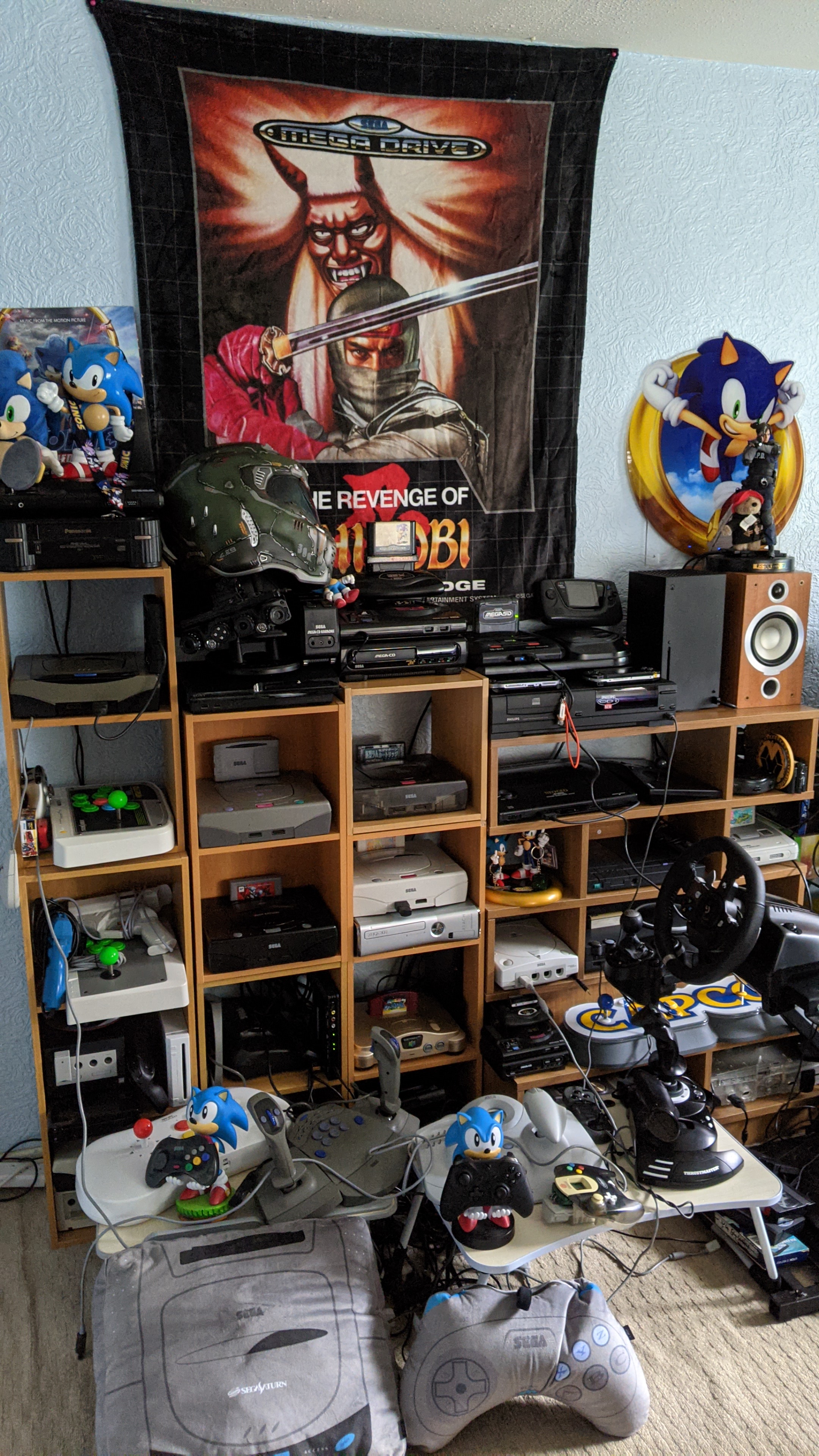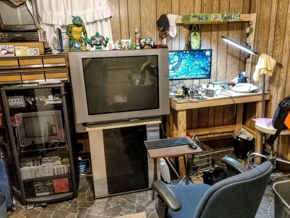 Lots of old systems on the shelf but not hooked up yet since the TVs don’t have the right inputs and we haven’t bothered to get converters yet. The green drawers on each side of the TVs are filled with old cartridge games and we’ve got all of the disc-based ones on a shelf nearby.