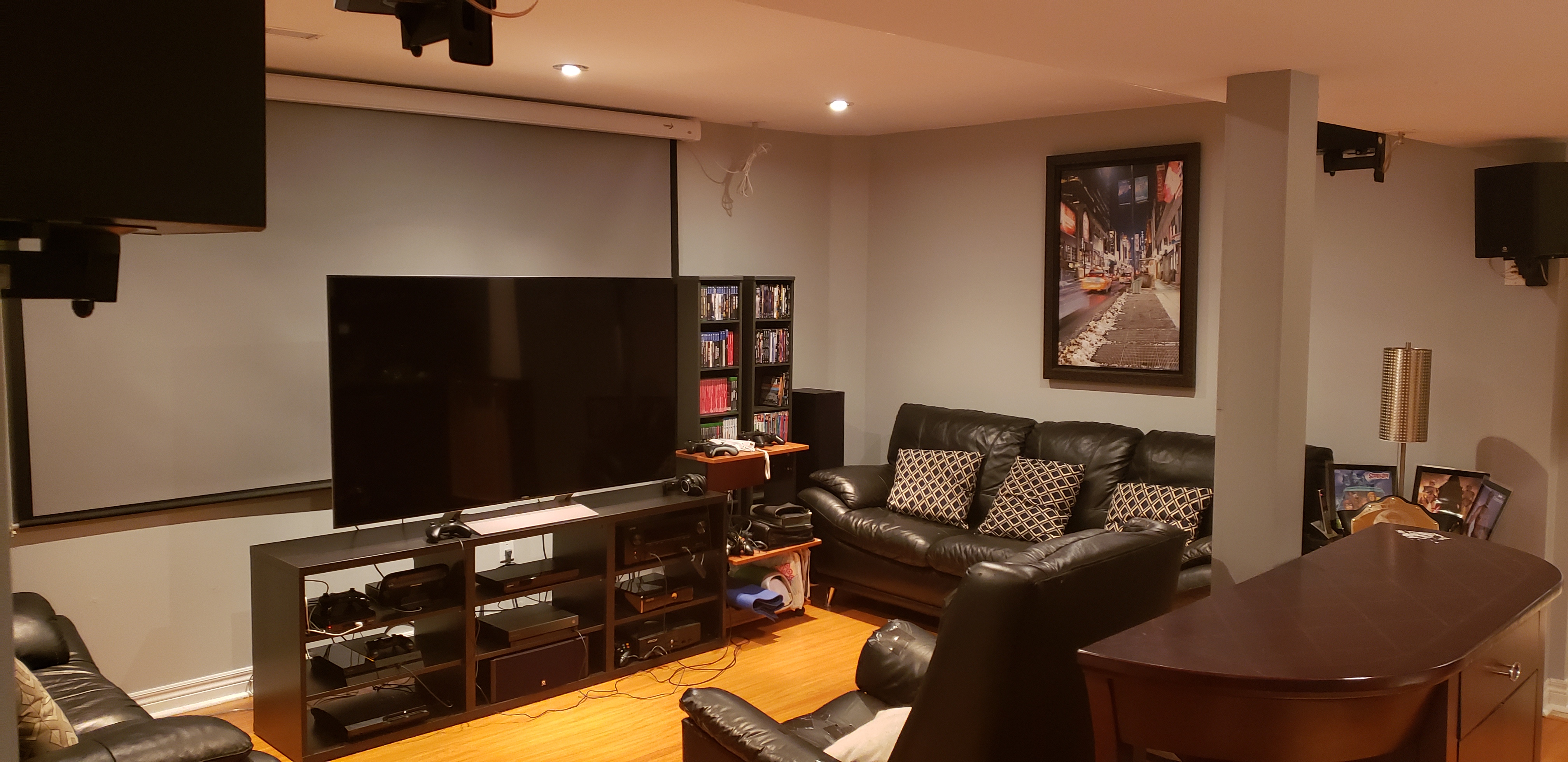 This is my setup. I have a Denon avr-x3600h 9.2 receiver, sony ubp-x700 4k blu ray player, 7.2 boston acoustic speakers/subs, (getting atmos speaker hopefully soon), viewsonic pro8200 projector, 120" elune vision projection screen when I’m in the mood for a theater experience, and a 65" sony x930e 4k tv for everything else. I have the og xbox, xbox 360, xbox one x scorpio edition, ps3, ps4 and the wii-u. With 3 small kids, it’s hard finding time to come down here and enjoy, but every so often I get the chance to crank it up