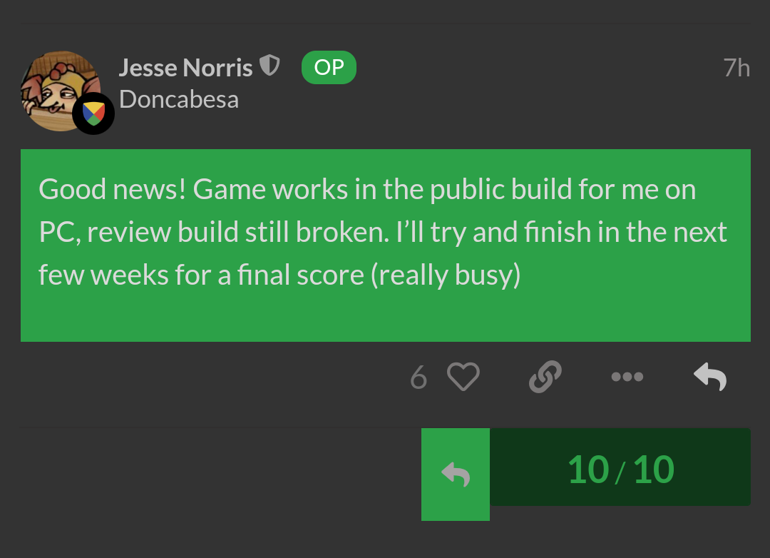Good news! Game works in the public build for me on PC, review build still broken. I’ll try and finish in the next few weeks for a final score (really busy)