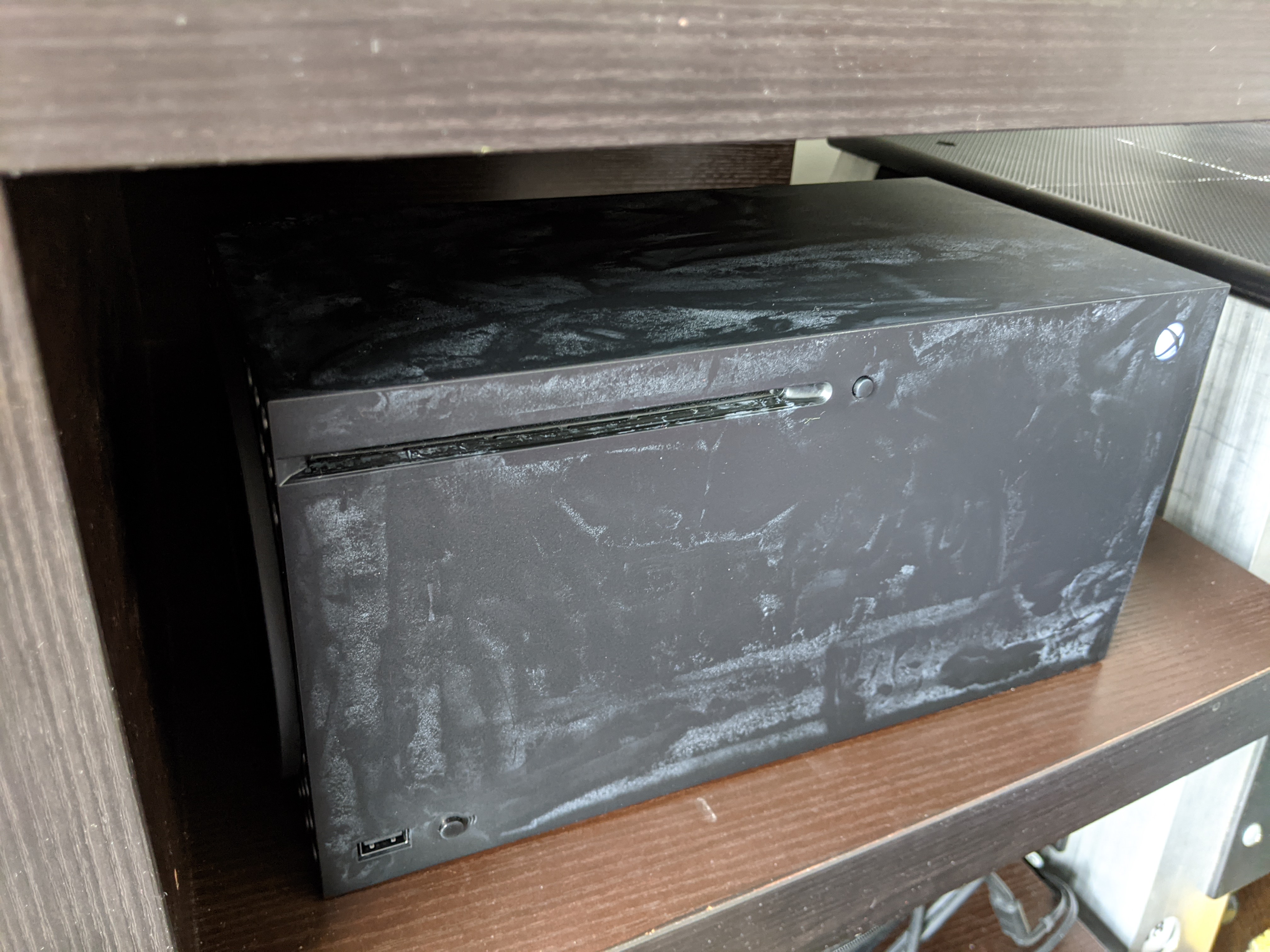 This is what mine was like, but it was not noticeable from the rooms main light, only when I flashed a flashlight on it, however daylight may have also exposed it, since making this thread I have checked my seriesX about 3 times and the same residue has not come back.