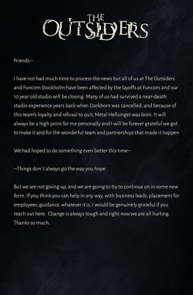 Oh man really? I might need to make a blue sky account and say some words. Metal Hellsinger is literally one of my favorite games ever. 20% of the value I get out of my YouTube premium account is listening to Metal Hellsinger songs, and I keep wishing that they’ll do a Spotify release or some type of special vinyl. What a horrible loss.