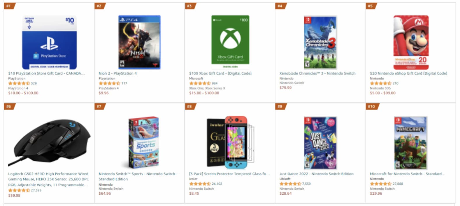 I’m curious about the gift card situation. If you click on any of them, they’re offered in various denominations. But the product titles in the list show $10 for PlayStation, $100 for Xbox, and $20 for Nintendo. I wonder if that’s just a quirk of how they’re entered in Amazon’s database, or if it’s reflecting the most popular denomination sold. I’m suspecting the former, but if it’s the latter that’s a nice little side gig for Xbox.