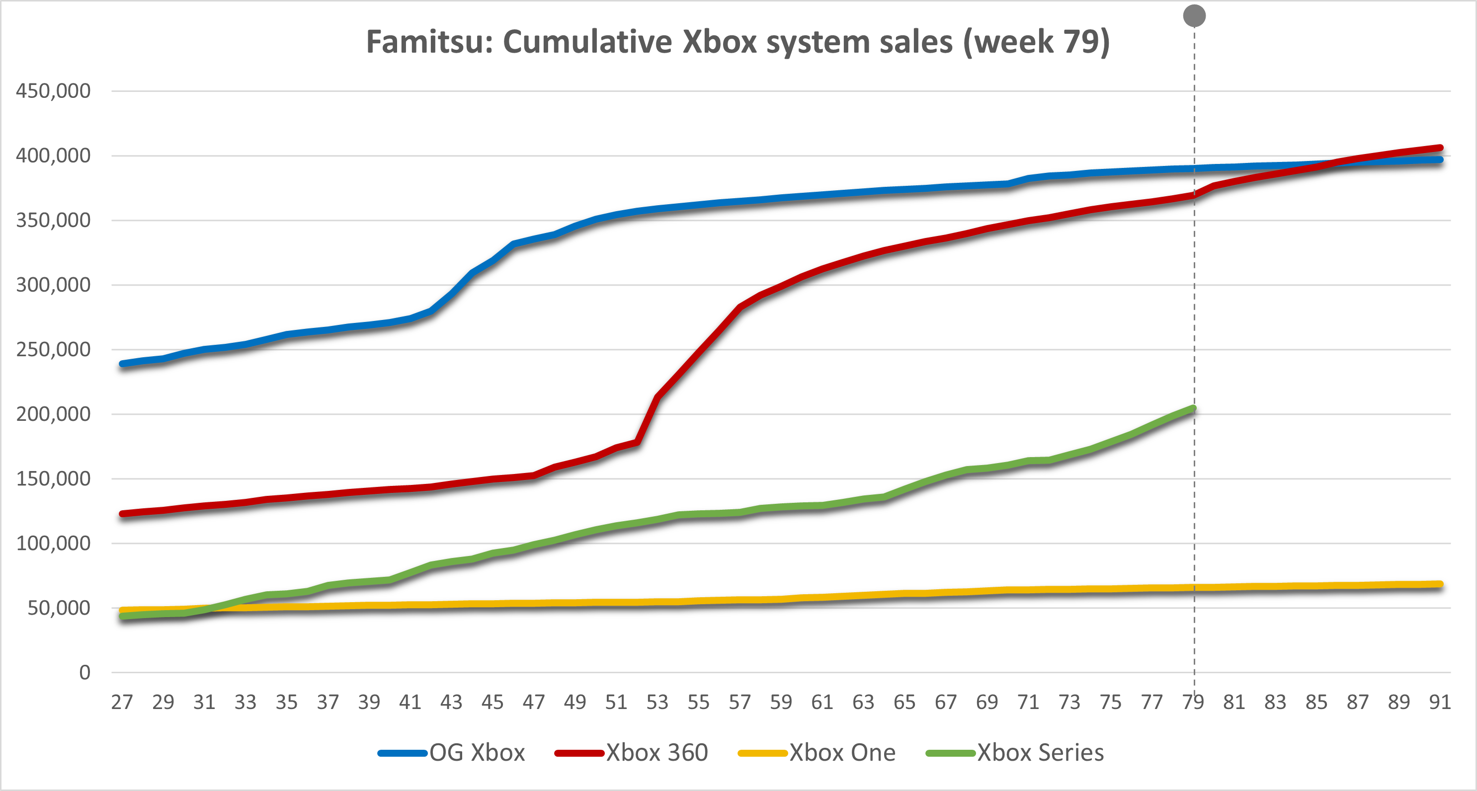 Here are launch aligned Famitsu numbers for Japan, going back 10 weeks and forward 5 weeks just to give you a sense. Series is behind cumulatively because of a slow start, and its biggest weeks aren’t close to the 360 which did as high as 25-30k when big Japanese games launched. But Series is doing well, no doubt.