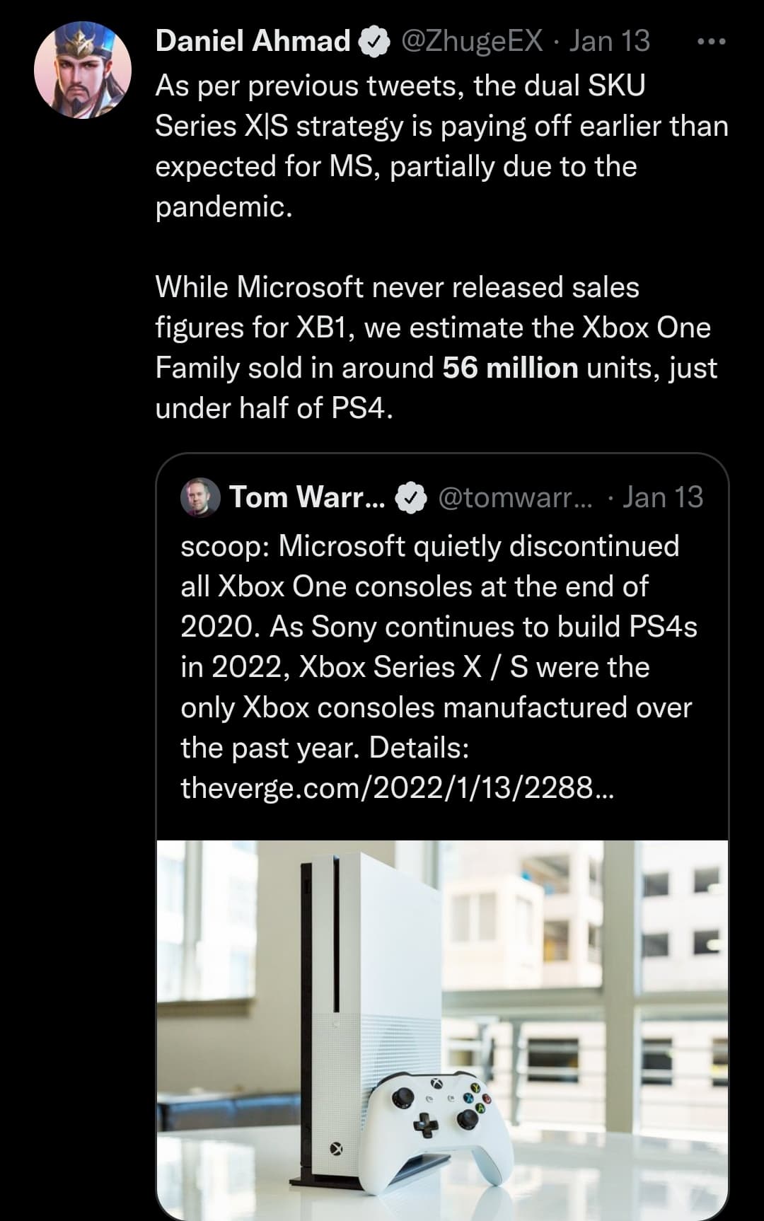 Xbox One selling half of Ps4 is an achievement in itself considering how poor it sold outside of USA and the software exclusivity on it. The one S and X definitely helped keep it relevant though. The BAse Xbox one is by far the worst xbox console I’ve owned. So much so That I did the unthinkable and bought multiplats on a PS console something I’ve never done and won’t do post that gen.