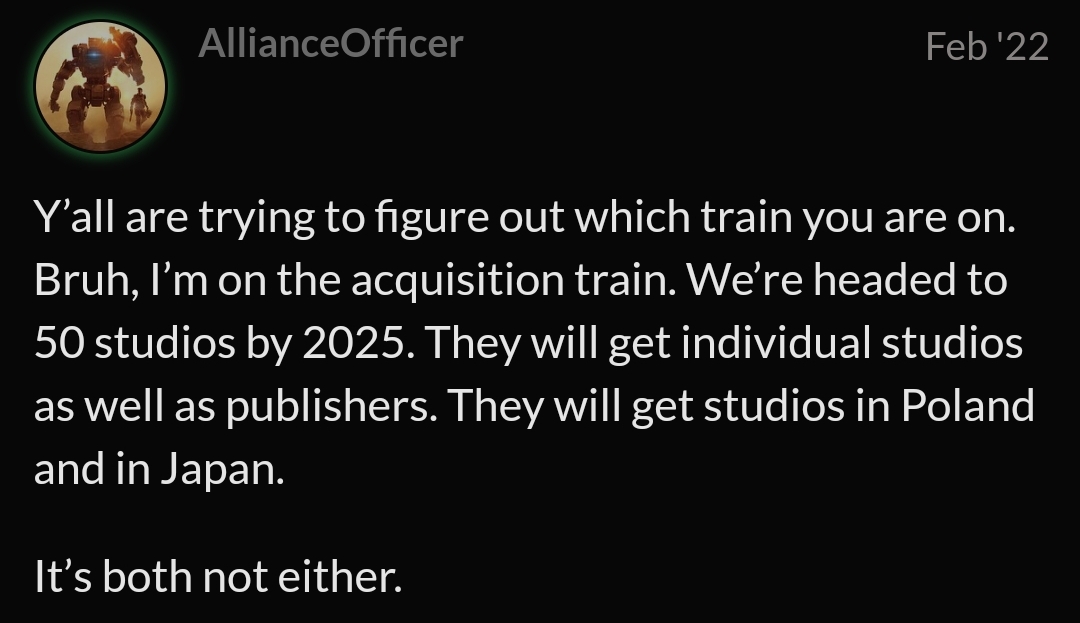 I think a lot of you don’t realize how much work ABK is going to be. They are considerably larger then all the studios they had before. Ive actually been part of some Aquisitions (not in gaming) and after 2 years at the soonest is when things start coming together. Not just that but Matt Booty is now handling Bethesda and Xbox game studios and has a lot on his plate.