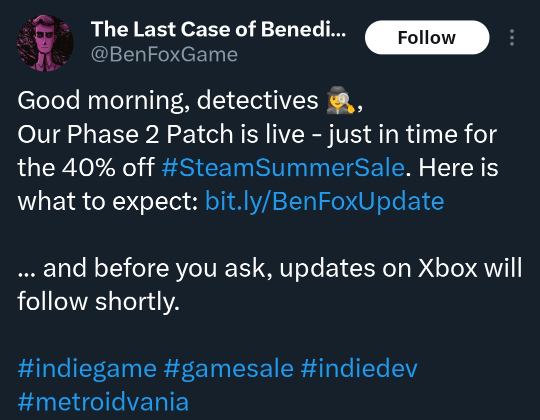 Iāve been holding off on playing it as well. From their Twitter account @BenFoxGame, they said the update for Xbox is supposed to come āsoonā.